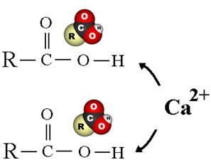 様々な金属、特にCa2+、Cu2+、Fe3+と強くキレート結合し、錯体を形成します。